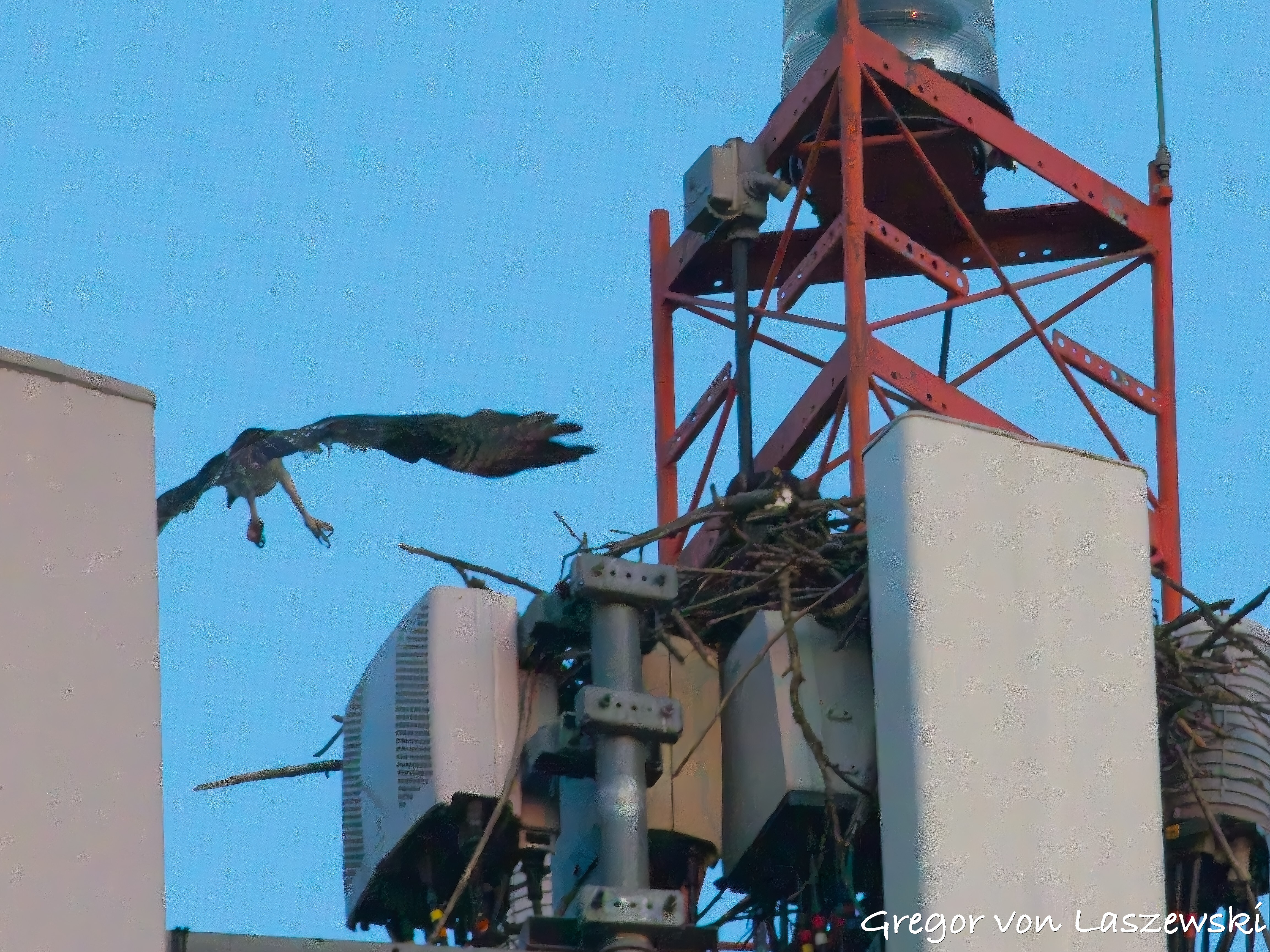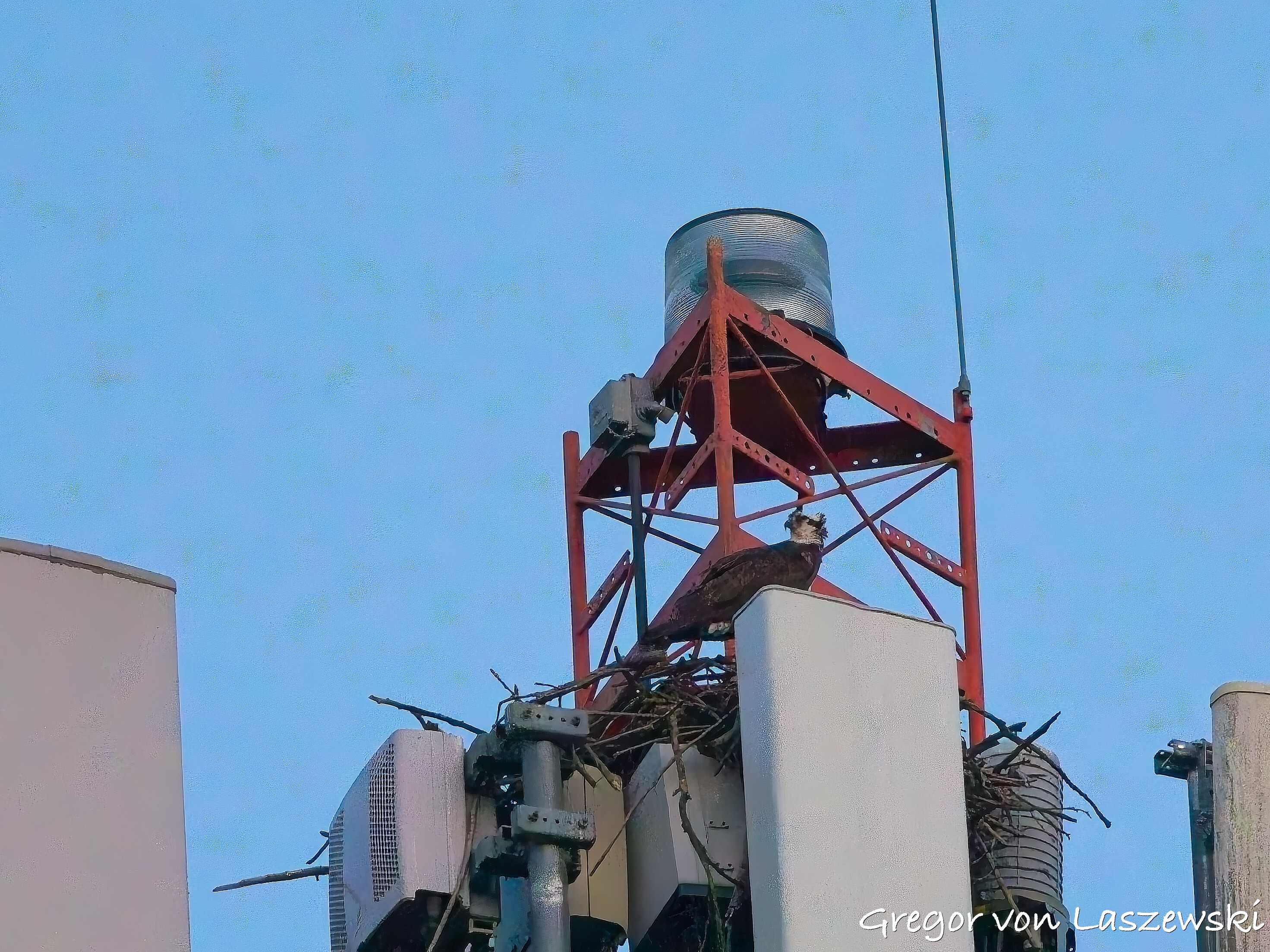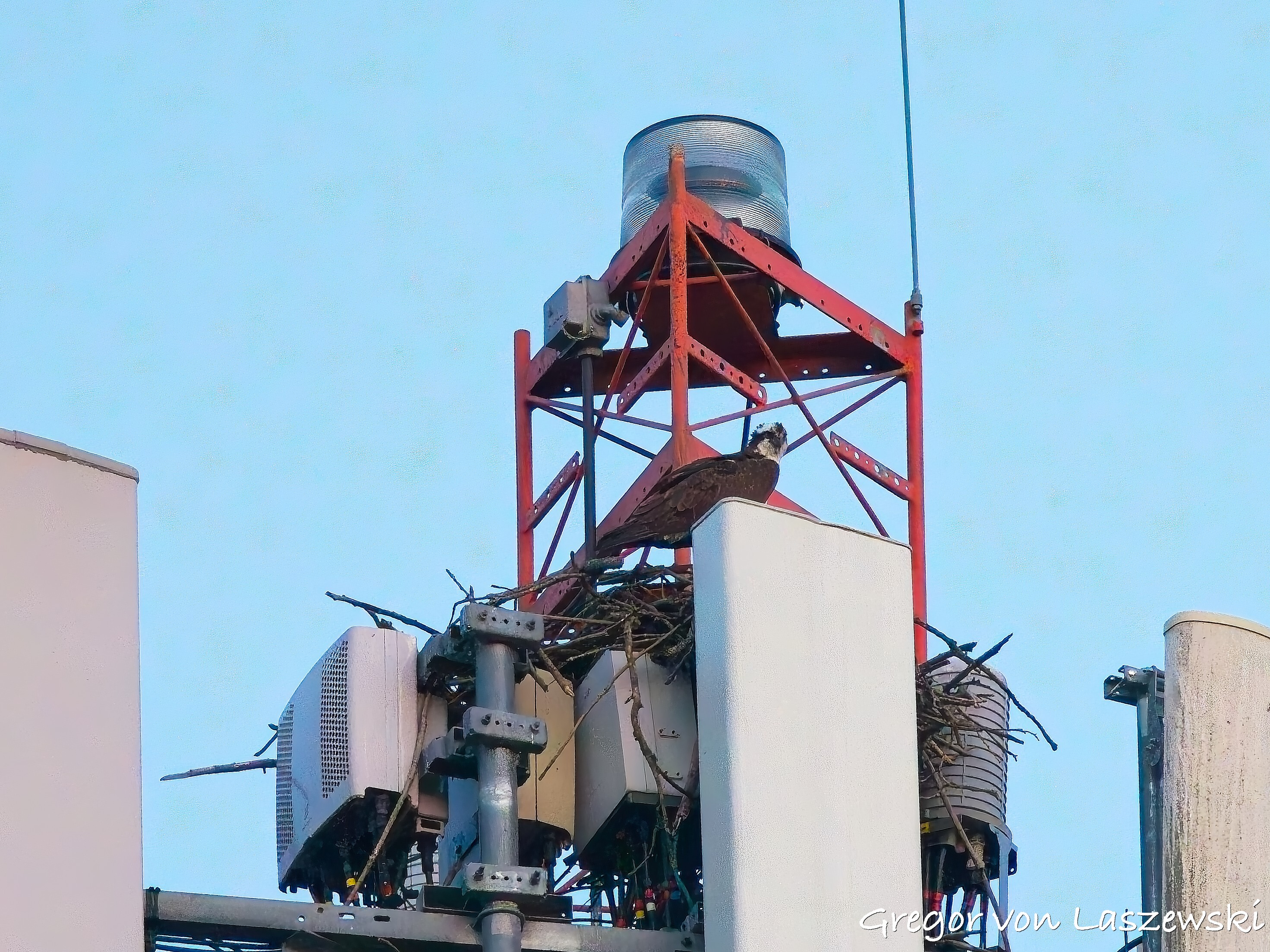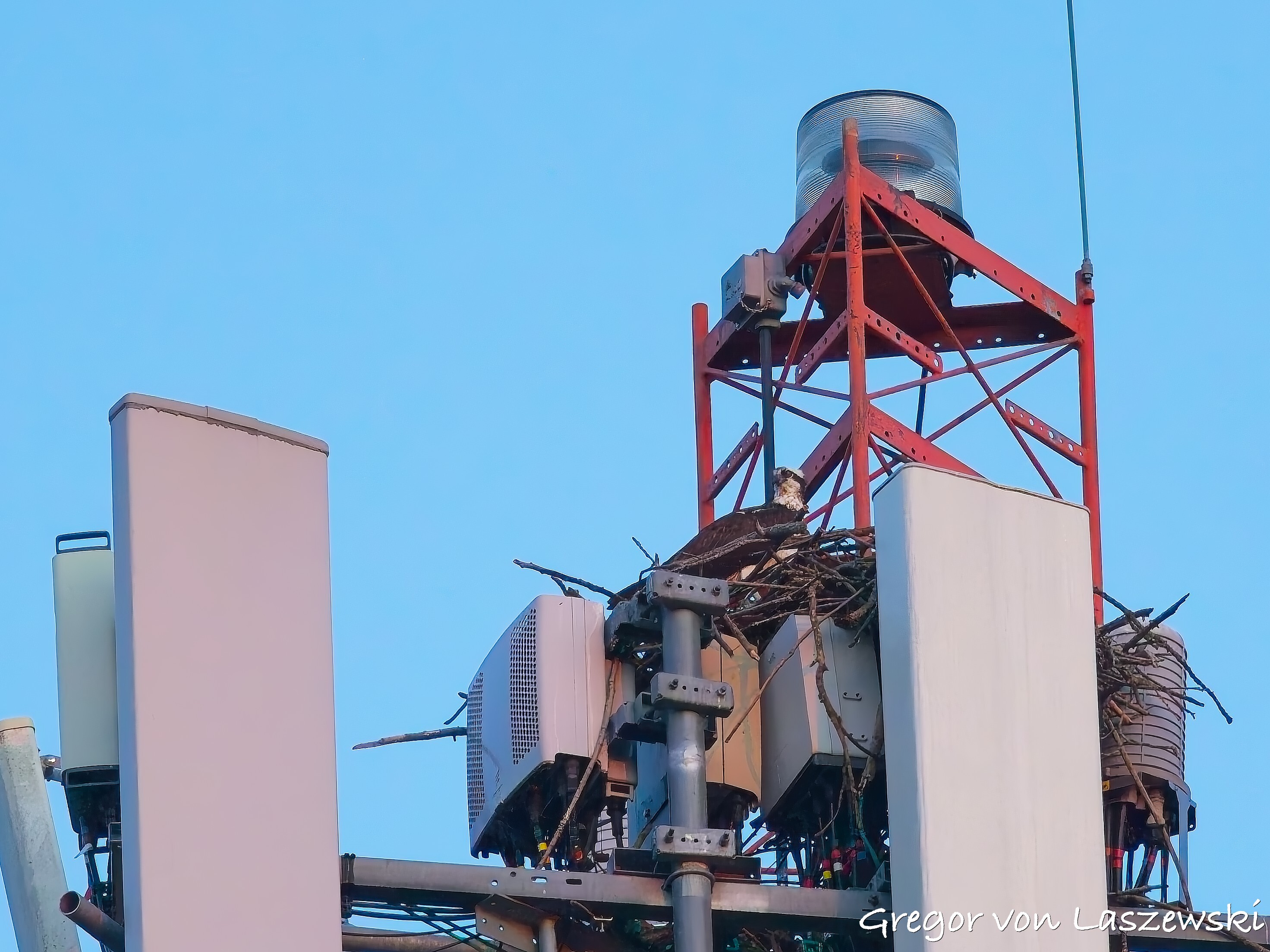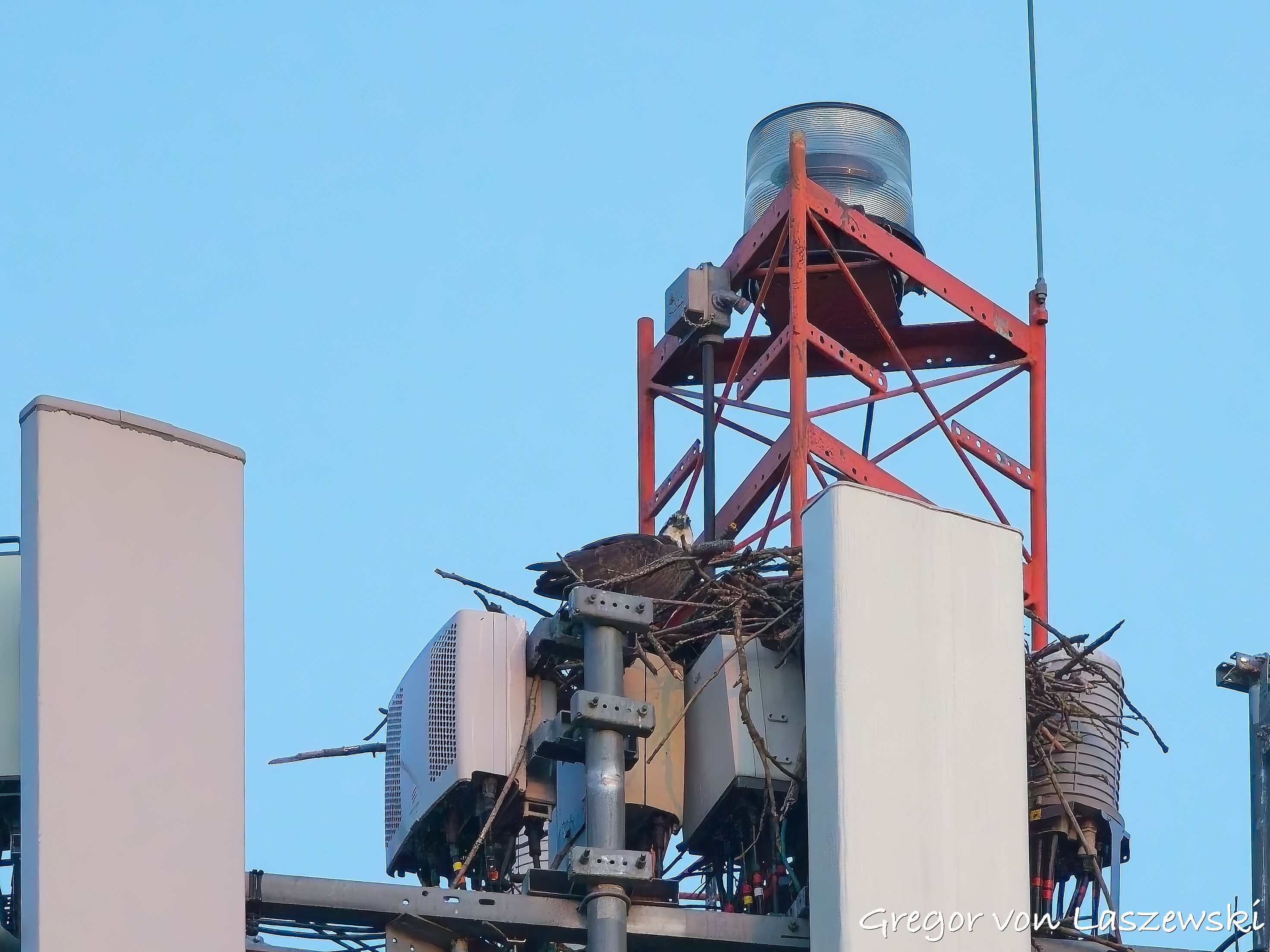 At 5:18 p.m., I happened to pass by the cell phone tower and saw an osprey heading toward it. I noticed it from a far distance while driving. I immediately drove—within the speed limit—to the tower. The osprey circled several times and even flew to the other side of the street for a while. I was lucky enough to catch it landing on the tower (see images). It took about nine minutes for the osprey to decide to land. I didn’t stay long, though, and continued with my plan to go to the lake. I had the boat in the water by around 6:00 p.m.