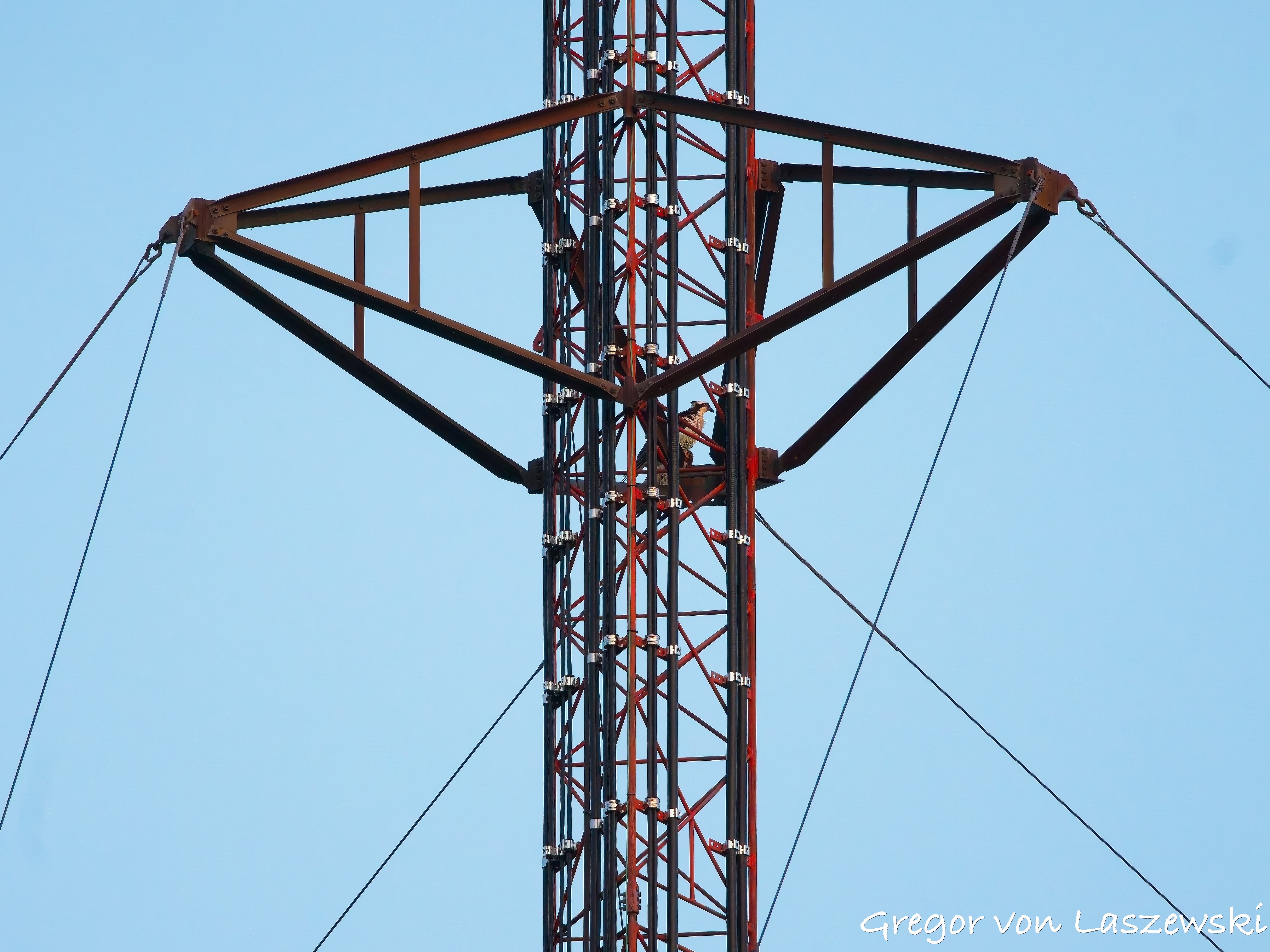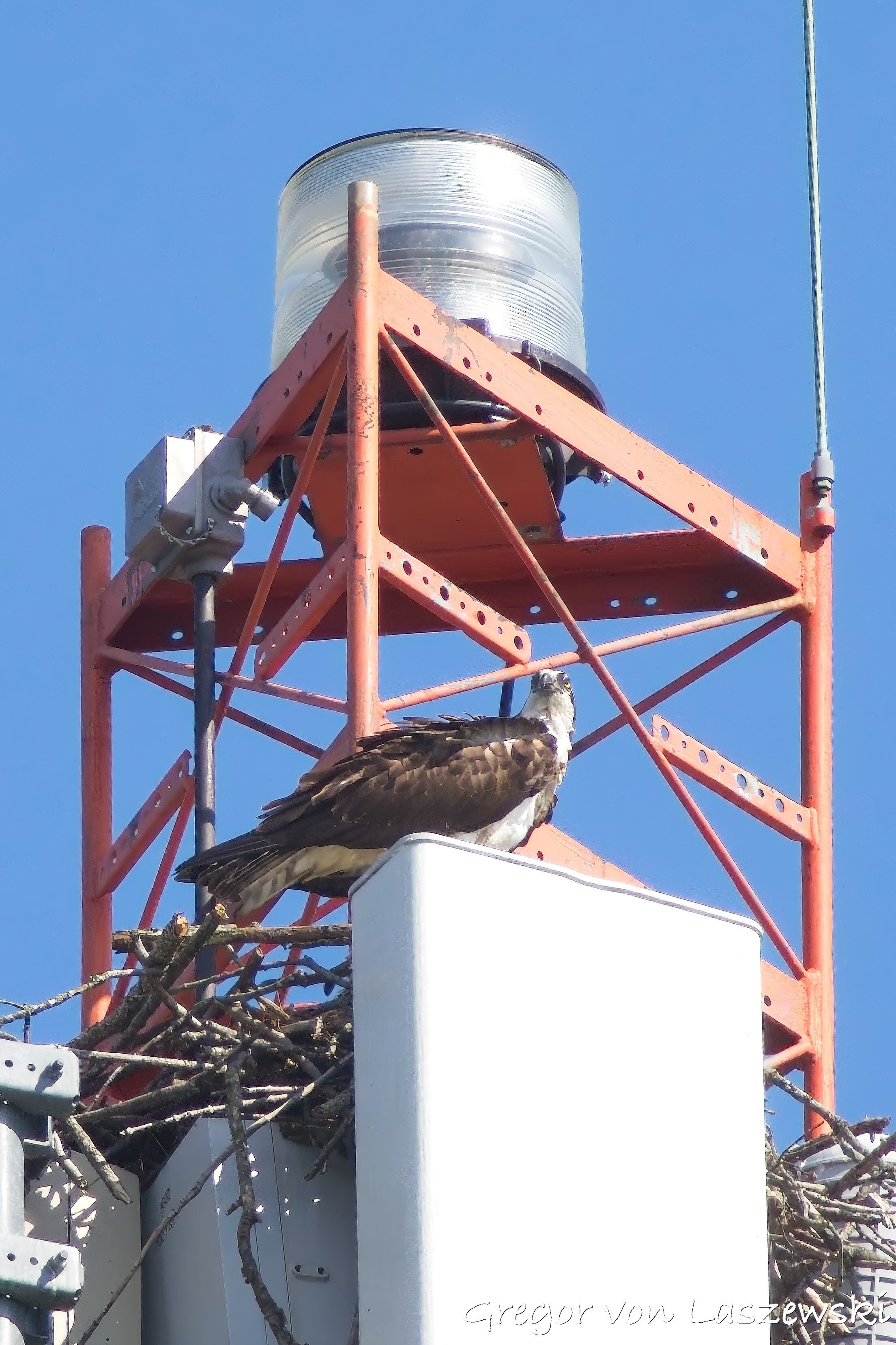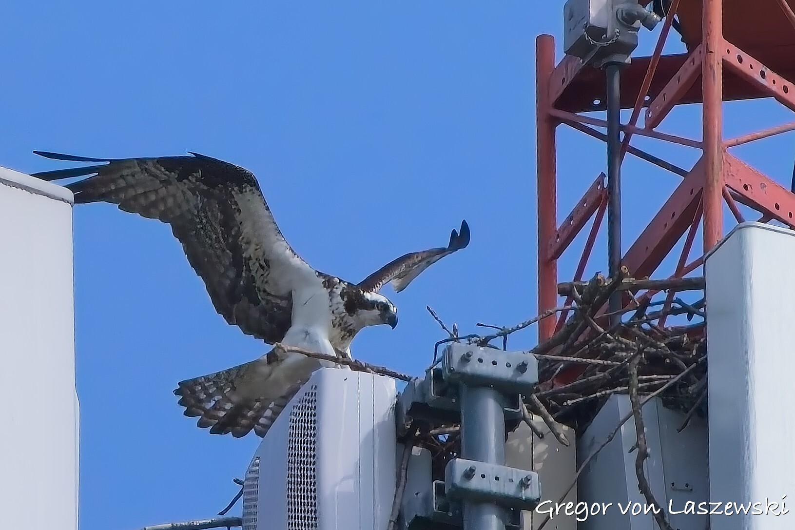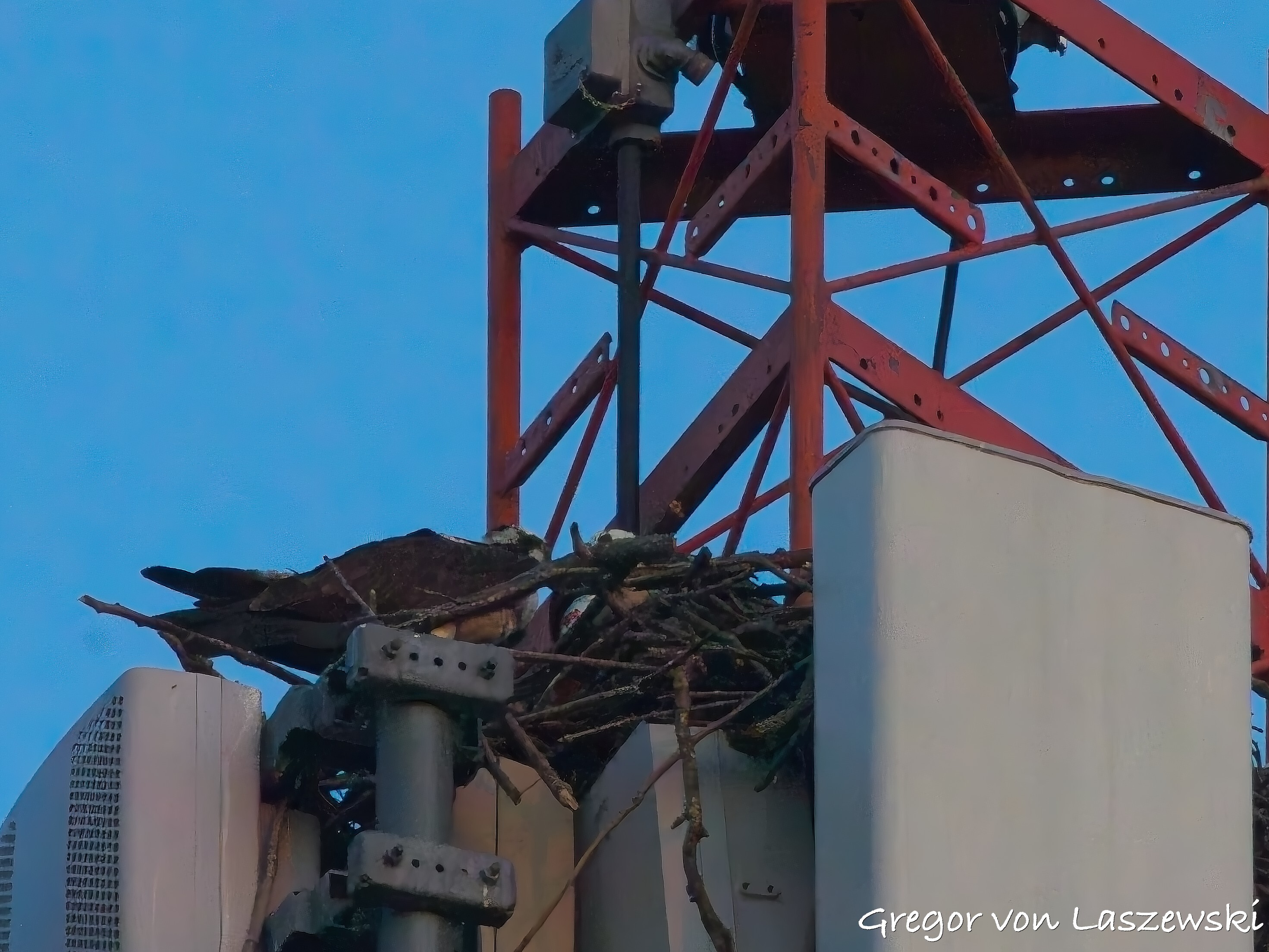 At 5:18 p.m., I happened to pass by the cell phone tower and saw an osprey heading toward it. I noticed it from a far distance while driving. I immediately drove—within the speed limit—to the tower. The osprey circled several times and even flew to the other side of the street for a while. I was lucky enough to catch it landing on the tower (see images). It took about nine minutes for the osprey to decide to land. I didn’t stay long, though, and continued with my plan to go to the lake. I had the boat in the water by around 6:00 p.m.