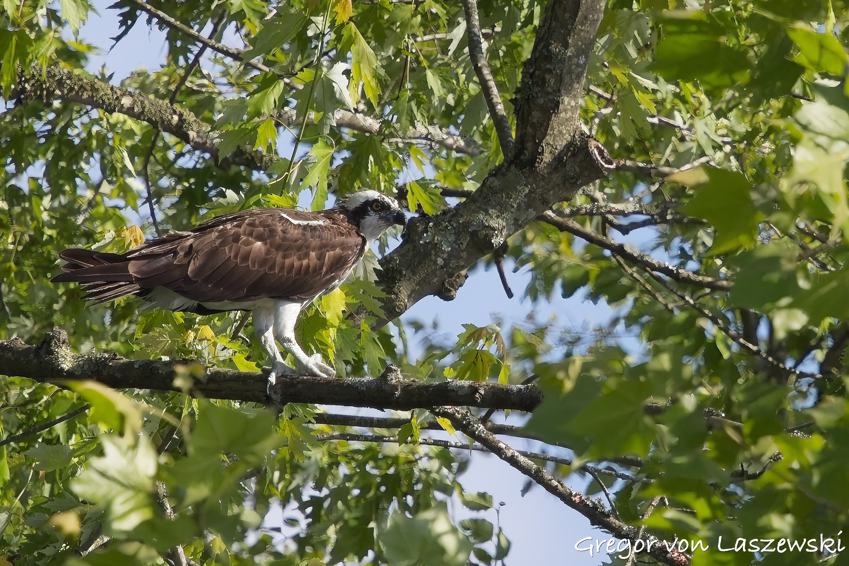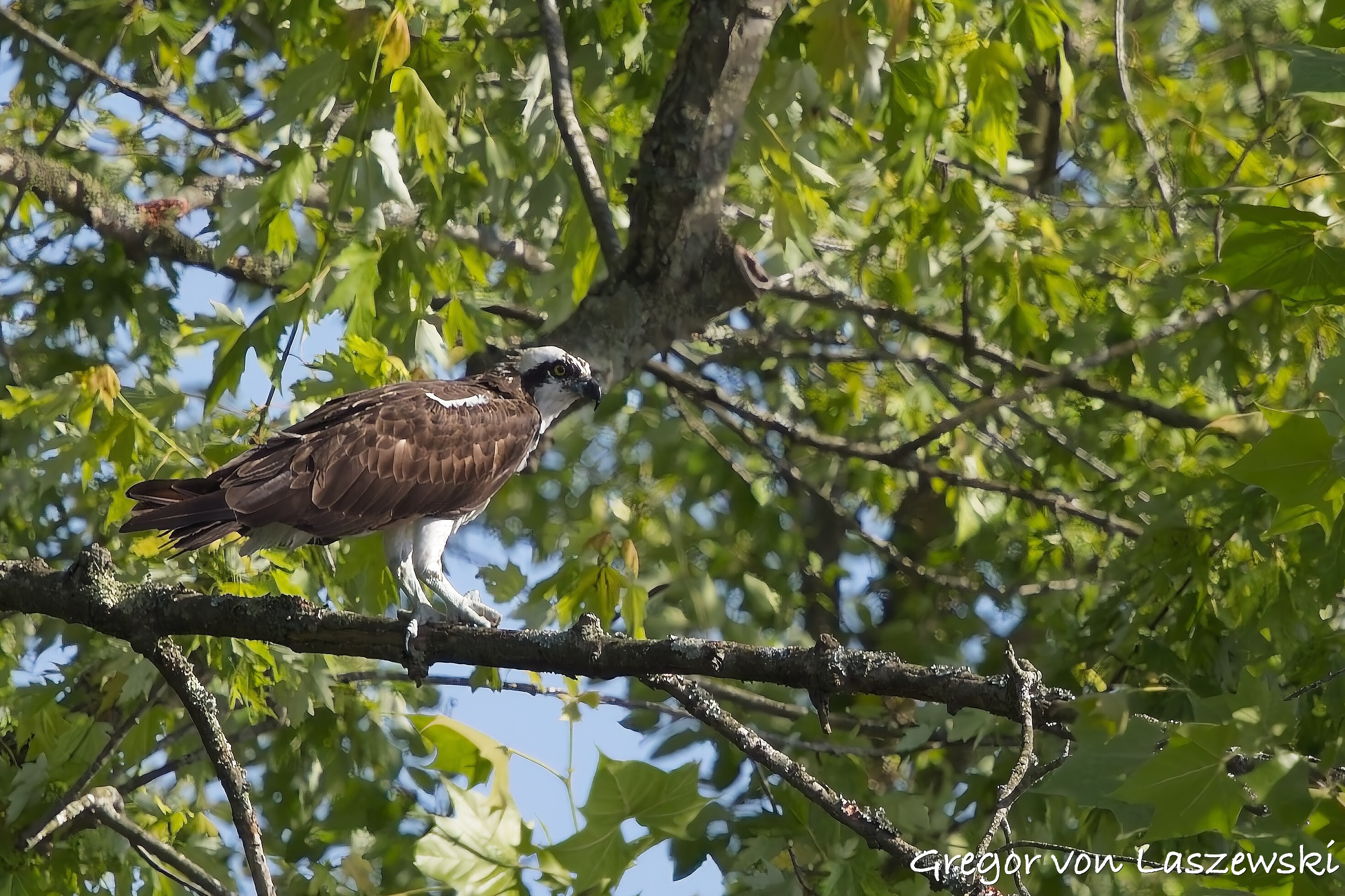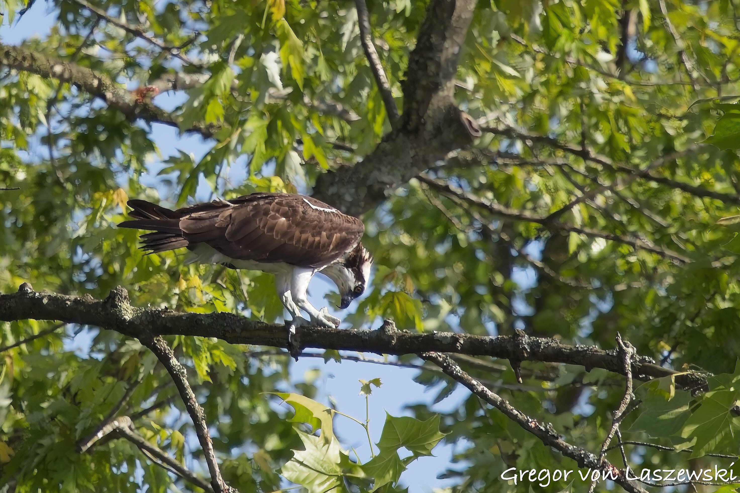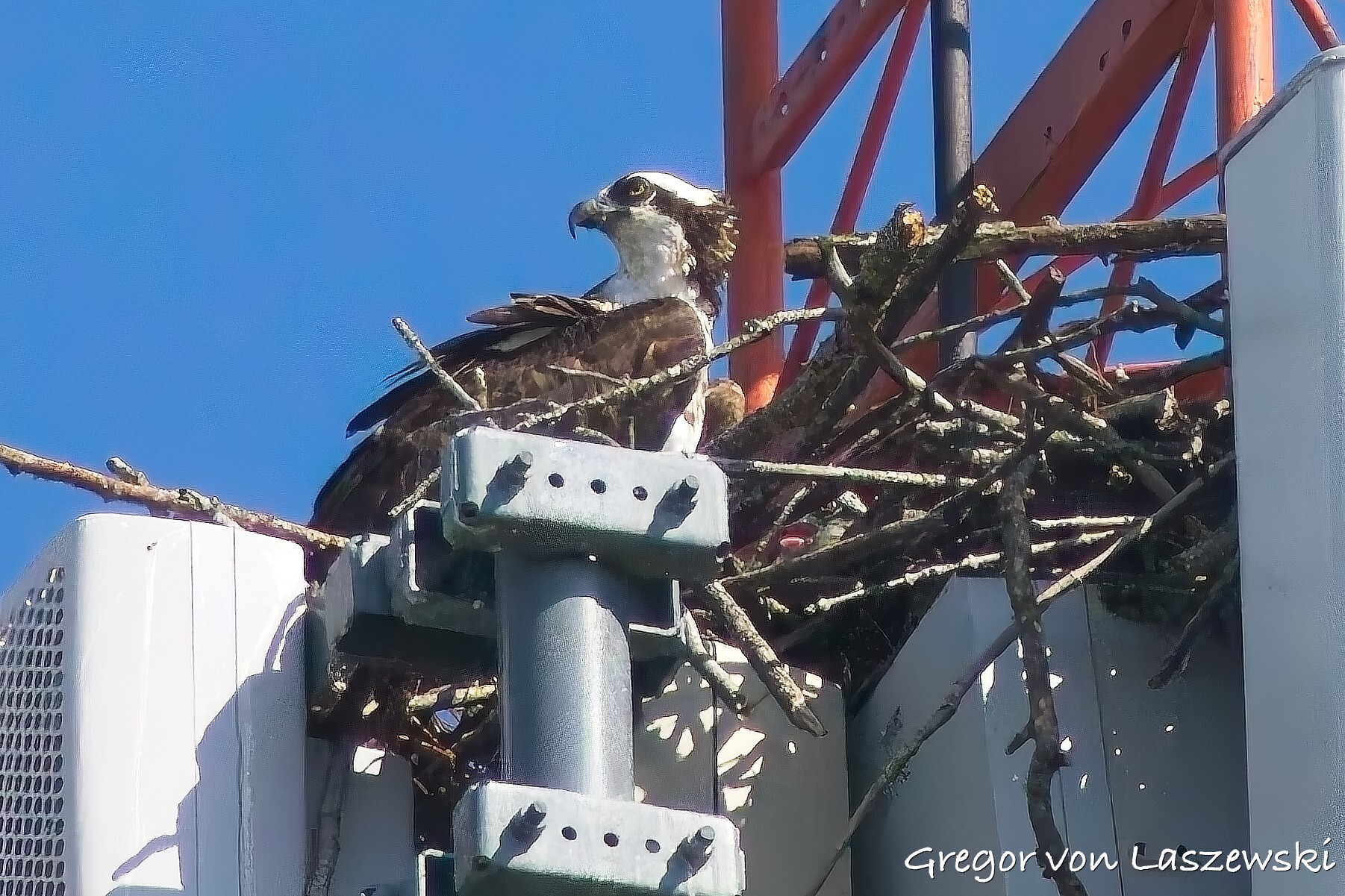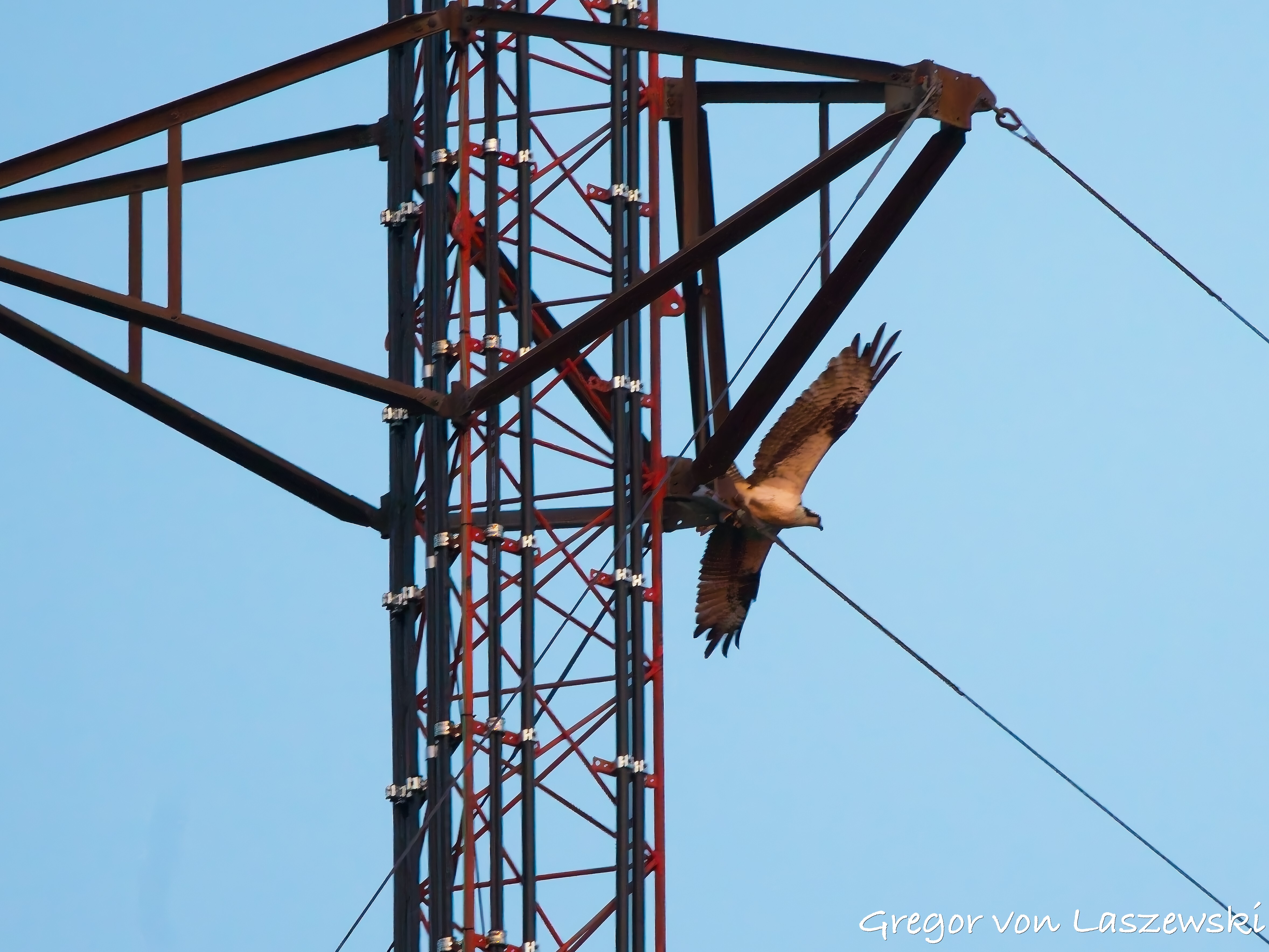 At 5:18 p.m., I happened to pass by the cell phone tower and saw an osprey heading toward it. I noticed it from a far distance while driving. I immediately drove—within the speed limit—to the tower. The osprey circled several times and even flew to the other side of the street for a while. I was lucky enough to catch it landing on the tower (see images). It took about nine minutes for the osprey to decide to land. I didn’t stay long, though, and continued with my plan to go to the lake. I had the boat in the water by around 6:00 p.m.