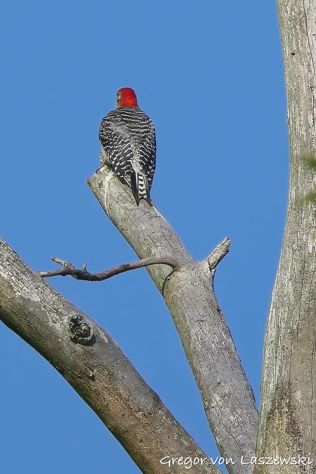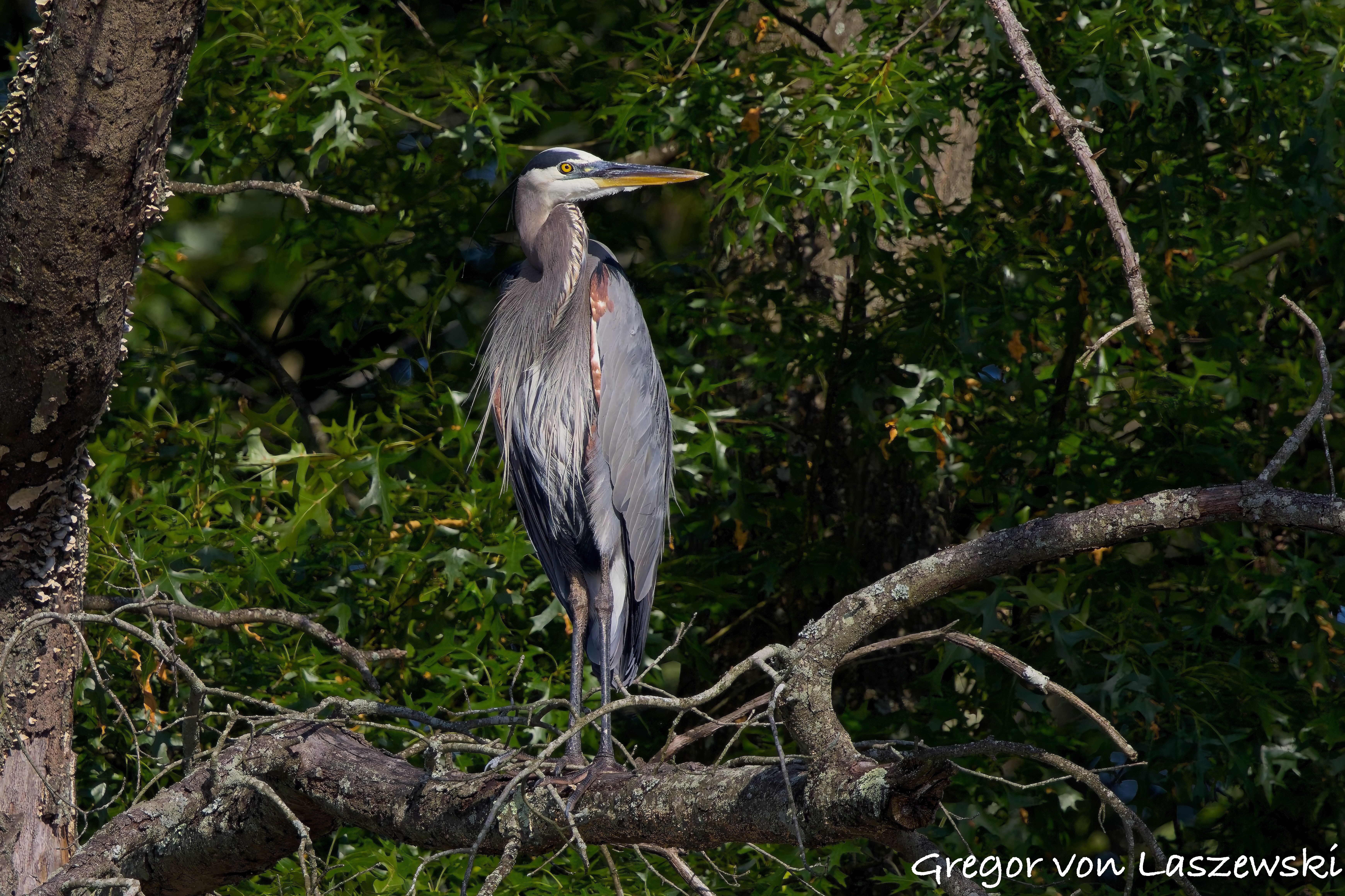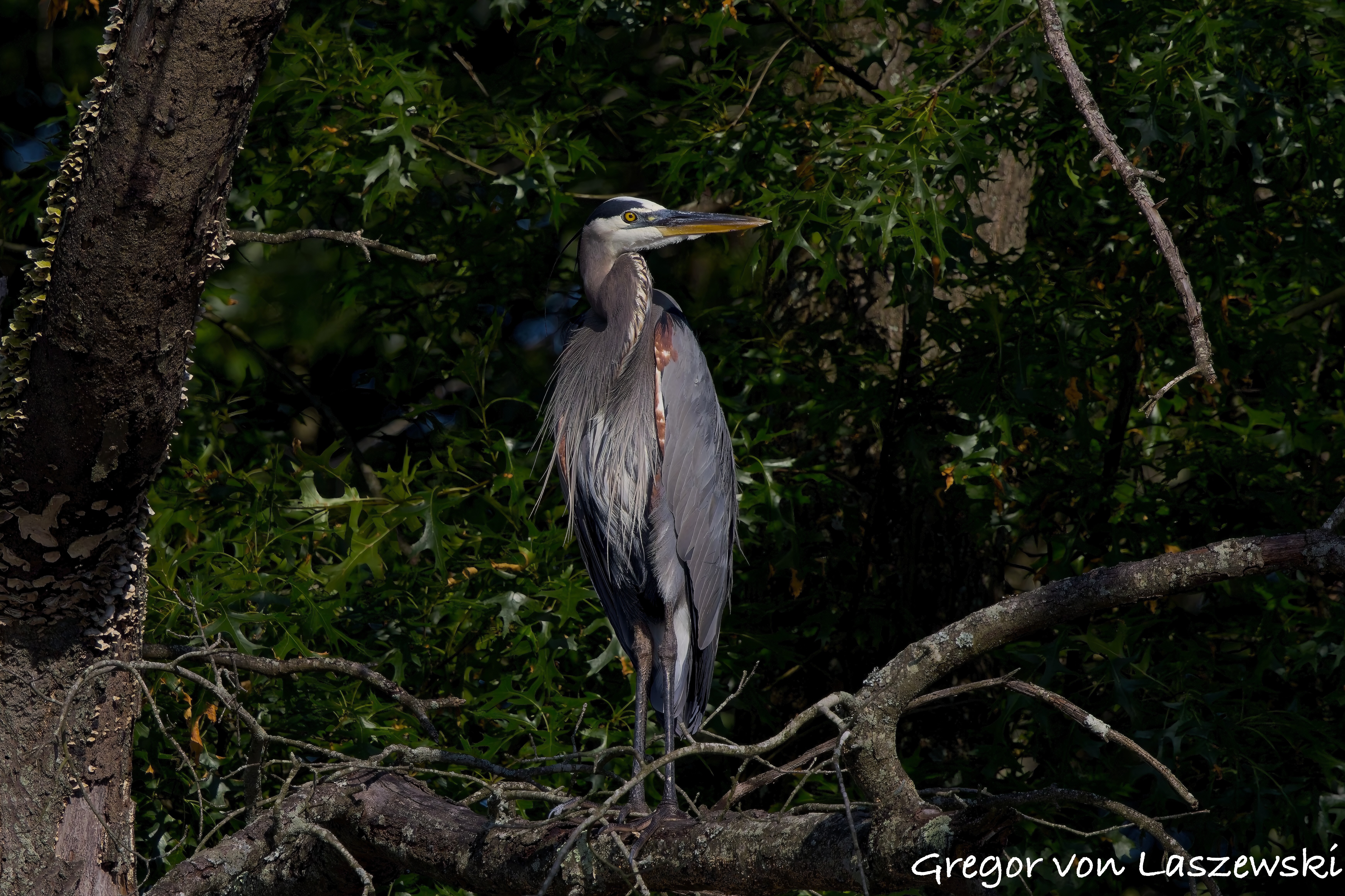 Even more luckily, the osprey perched in a nearby tree, allowing me to observe it eating on a branch. Once finished, it flew off to the south. I originally hoped to find great blue herons, and although I was disappointed they weren’t in their usual spots—likely due to the flooding—I finally found one in the trees. The lighting was beautiful, with a play of sun and shadow through the branches. In total, I saw four great blue herons. I also spotted a red-bellied woodpecker, although it refused to face me. Feeling like it might be my lucky day, I wondered if I might also see an eagle. After passing some fishermen who said they hadn’t seen one, I continued further south. Fortunately, I caught a glimpse of a large bird flying into a tree to perch. As I paddled closer, I was stunned—it was a beautiful bald eagle. I attached my 2x extender to the camera, giving me 1600mm of zoom, and observed the eagle from a distance.