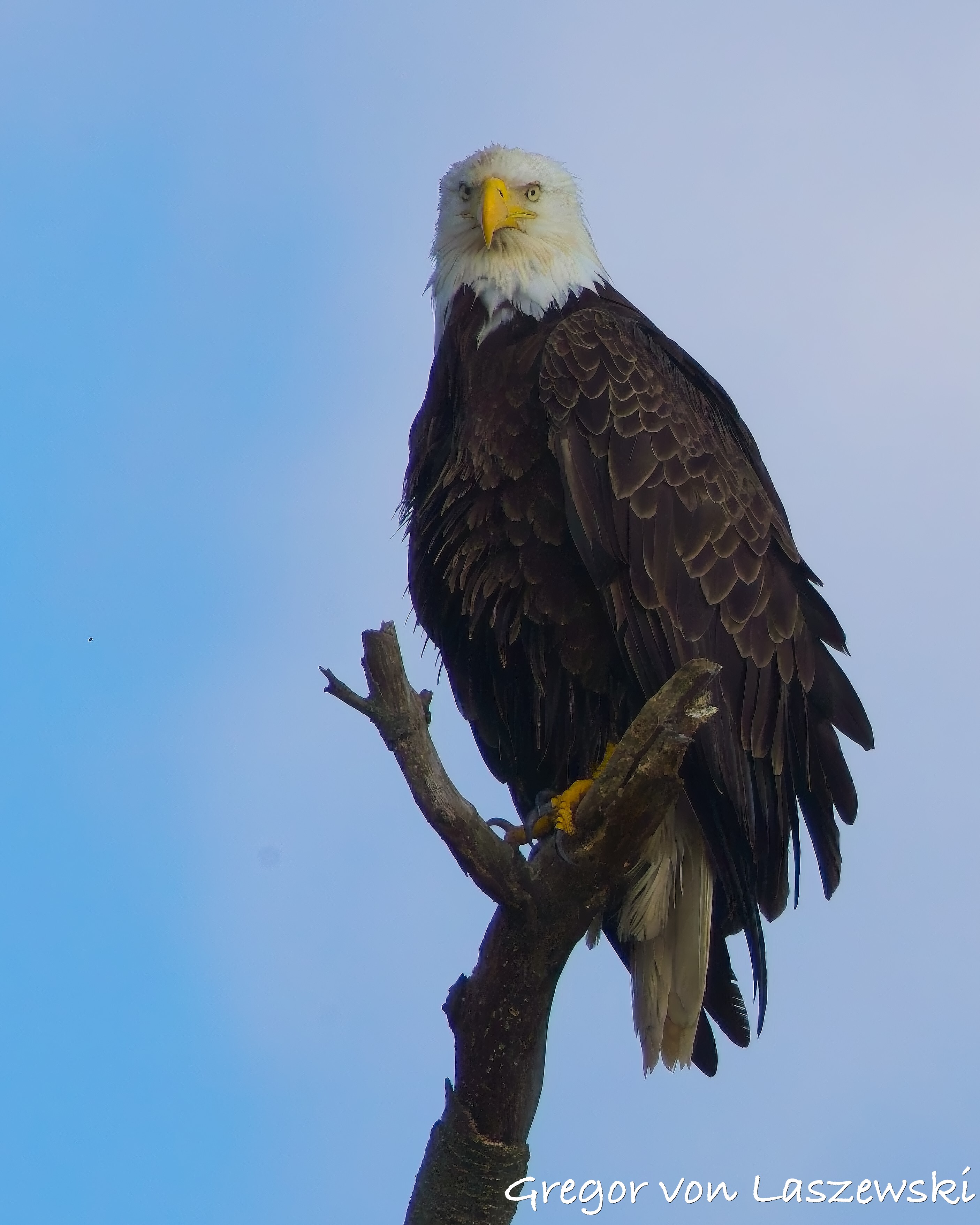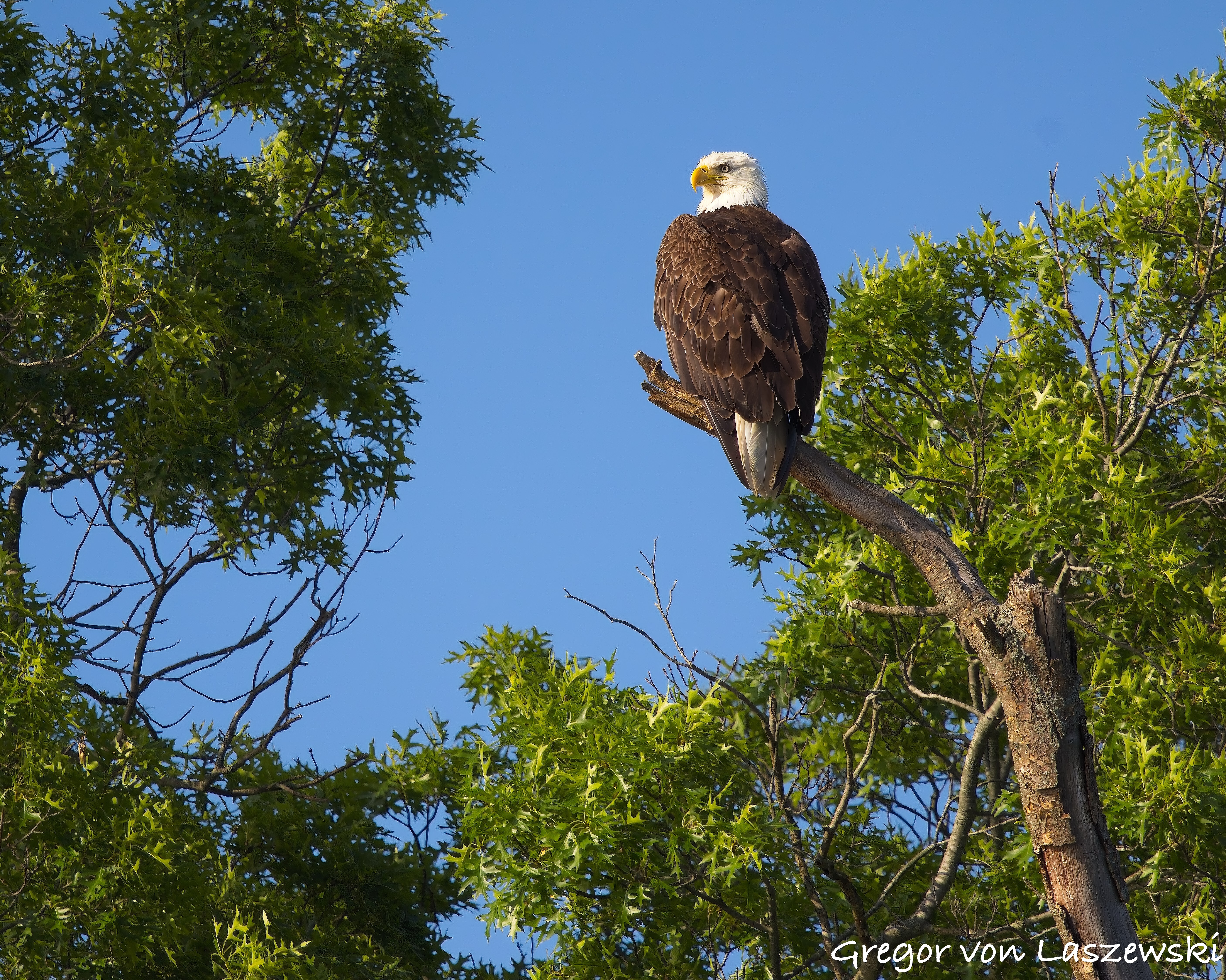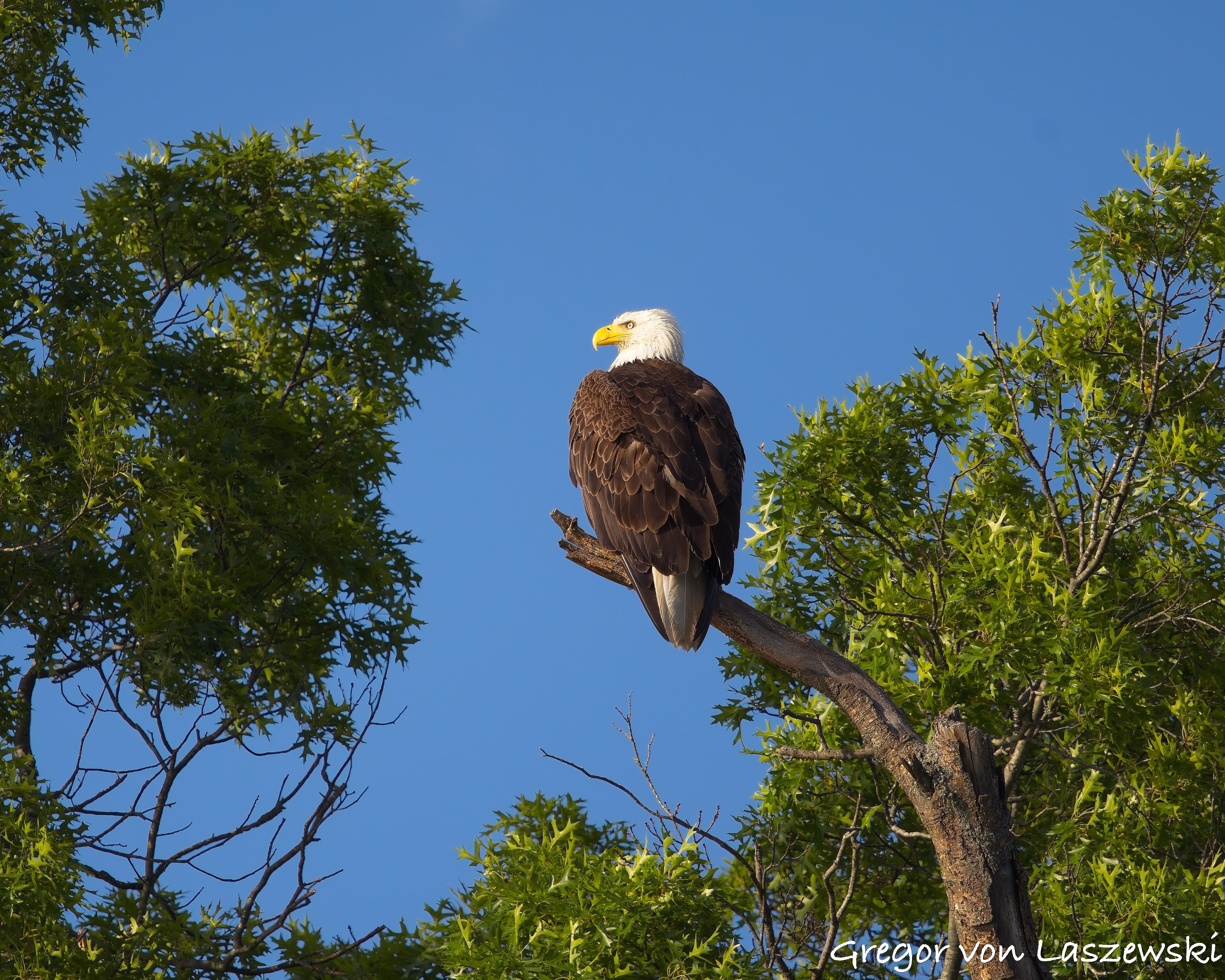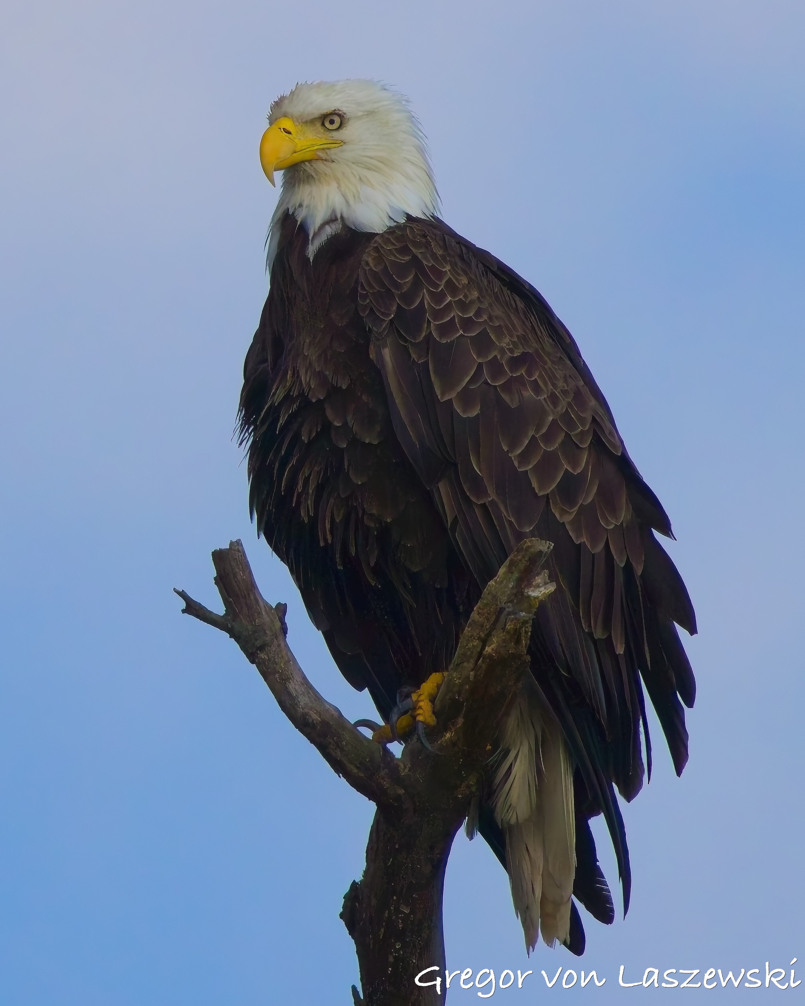 The eagle was calm, grooming and surveying the surroundings. Whenever the wind drifted me too close, I paddled back to a safe distance. A large pontoon boat nearby had to move as it drifted too close to shore. A woman aboard was disappointed and concerned that their engine might disturb the eagle. As the eagle looked toward their boat, I captured some great shots of it gazing straight at us. After that, the eagle relaxed again, and I continued observing for a while longer. Wanting to avoid being out after dark, I eventually headed back.