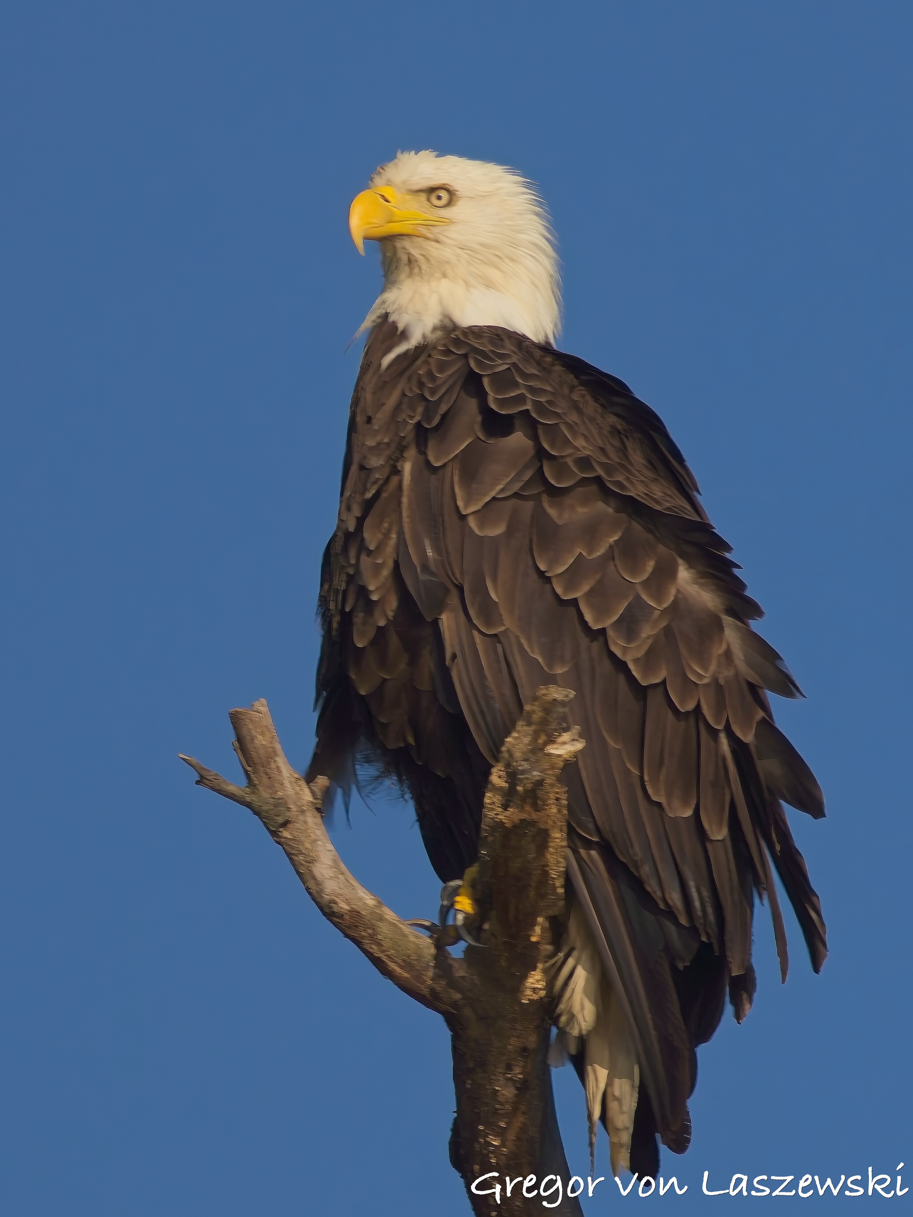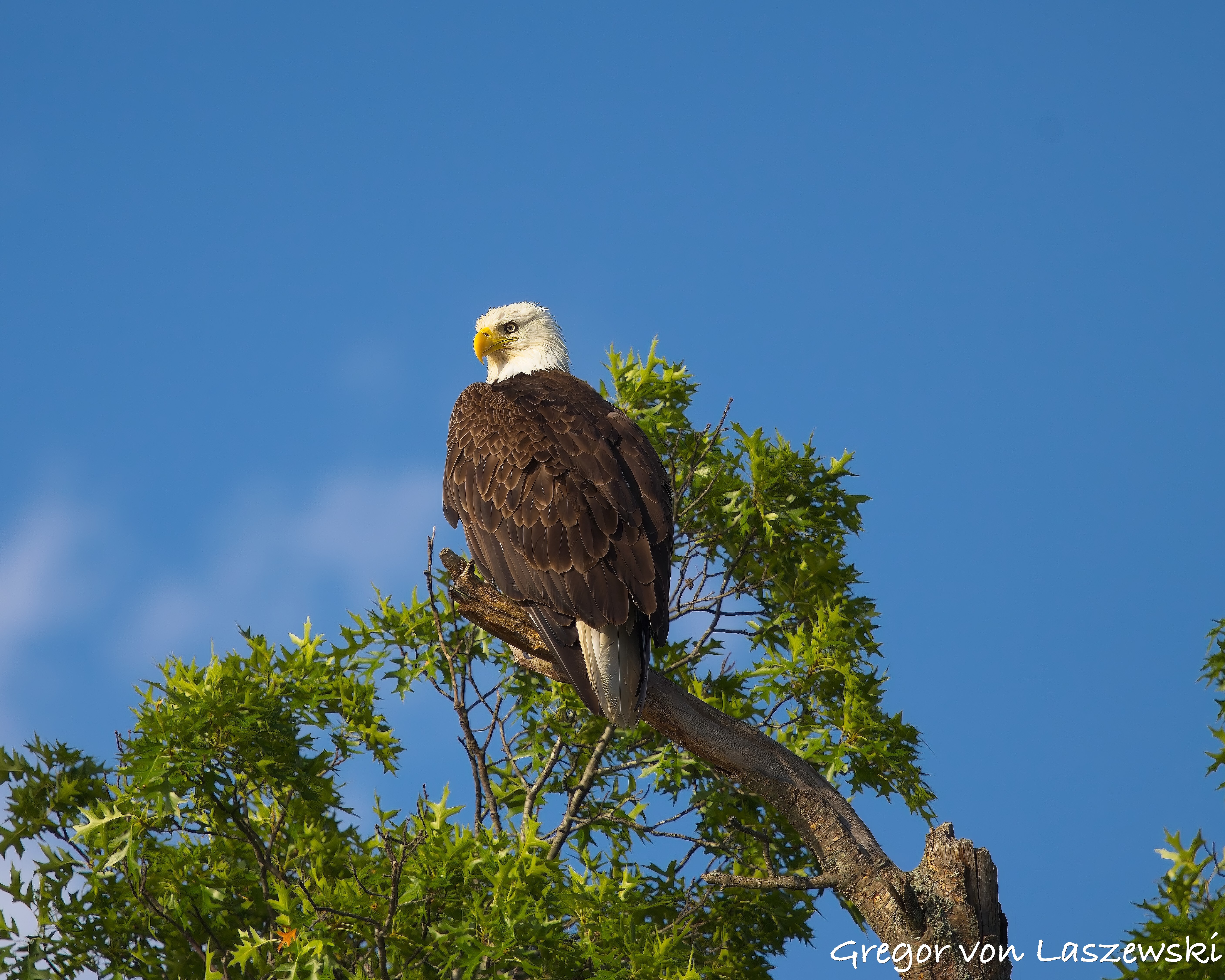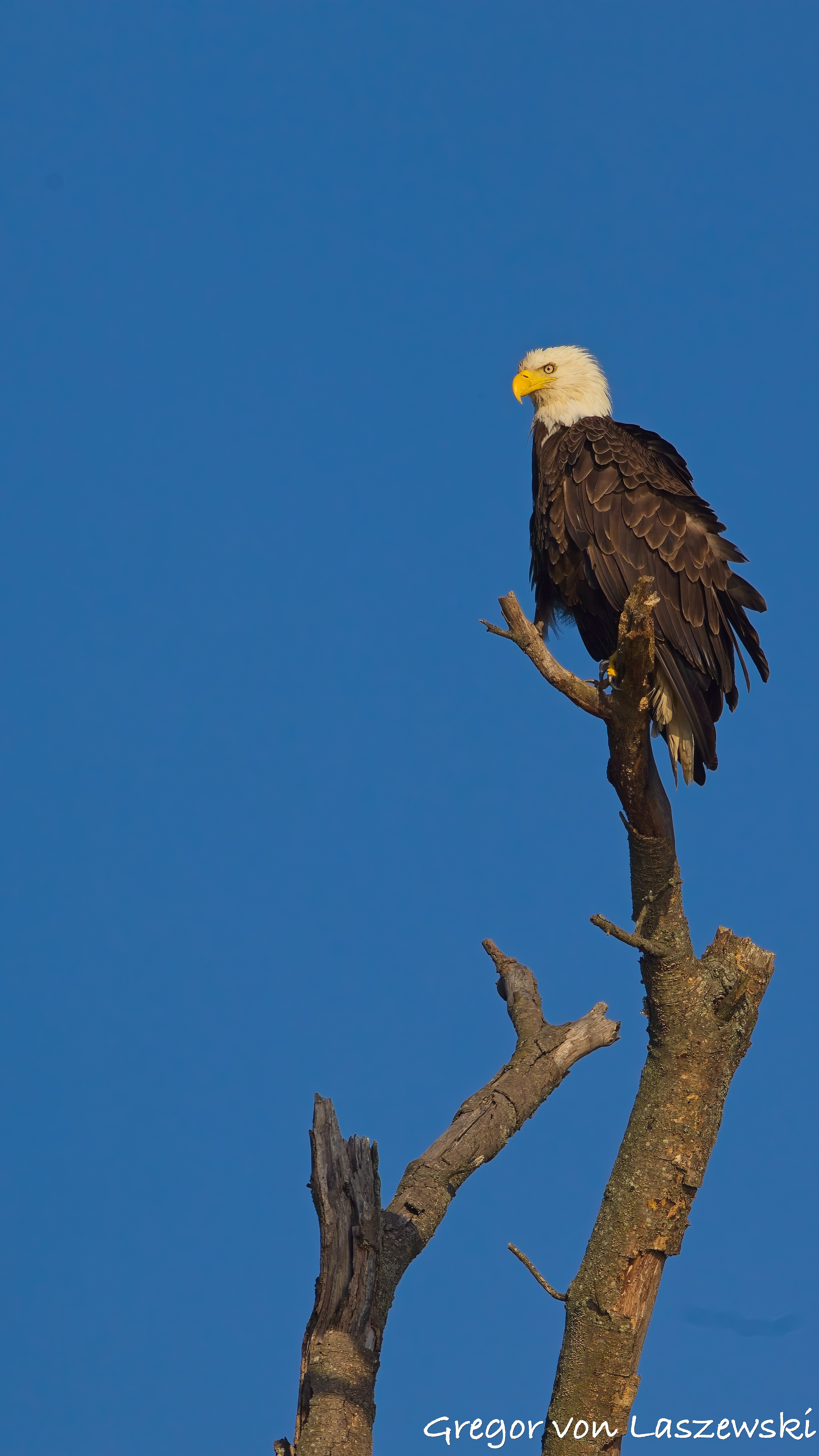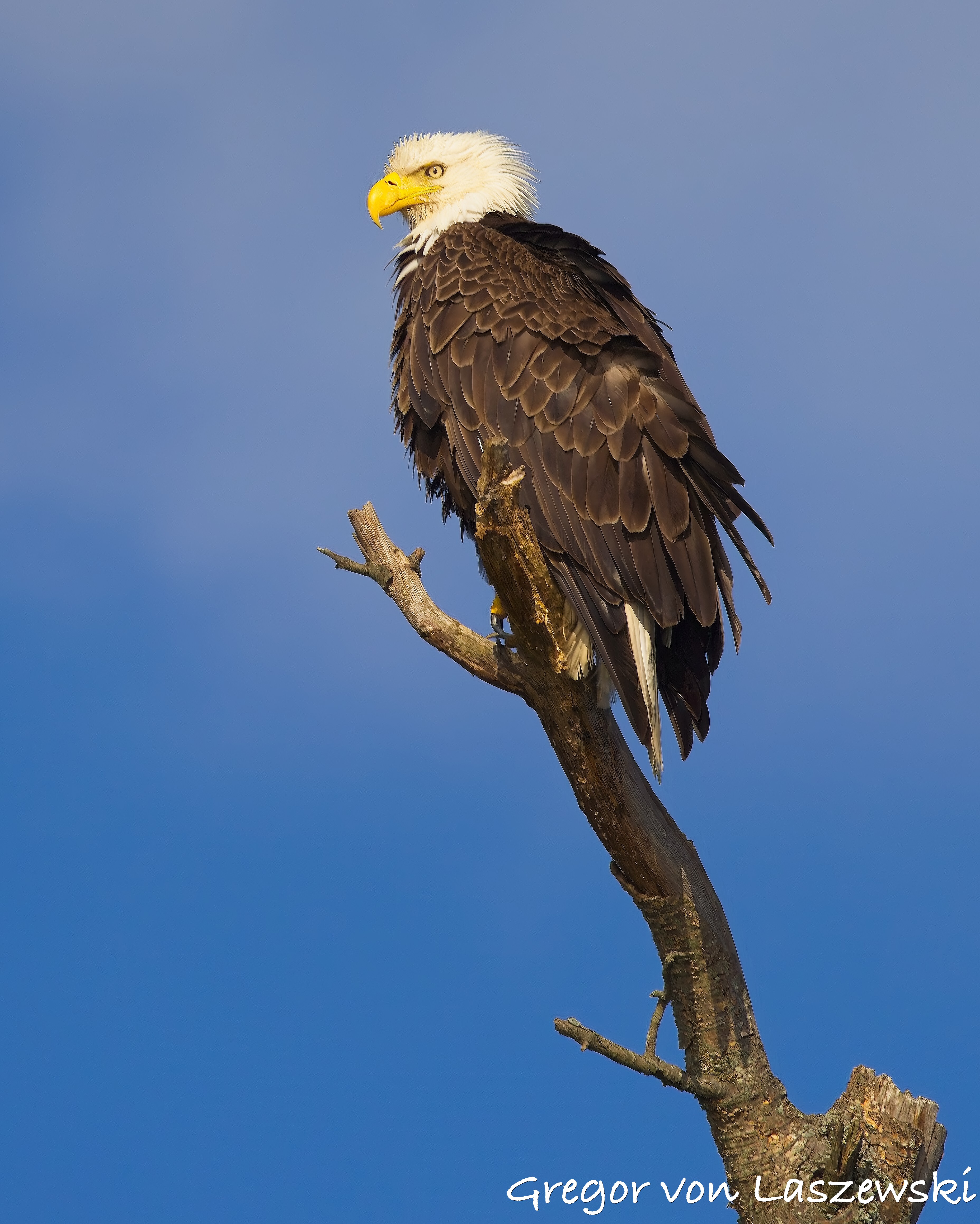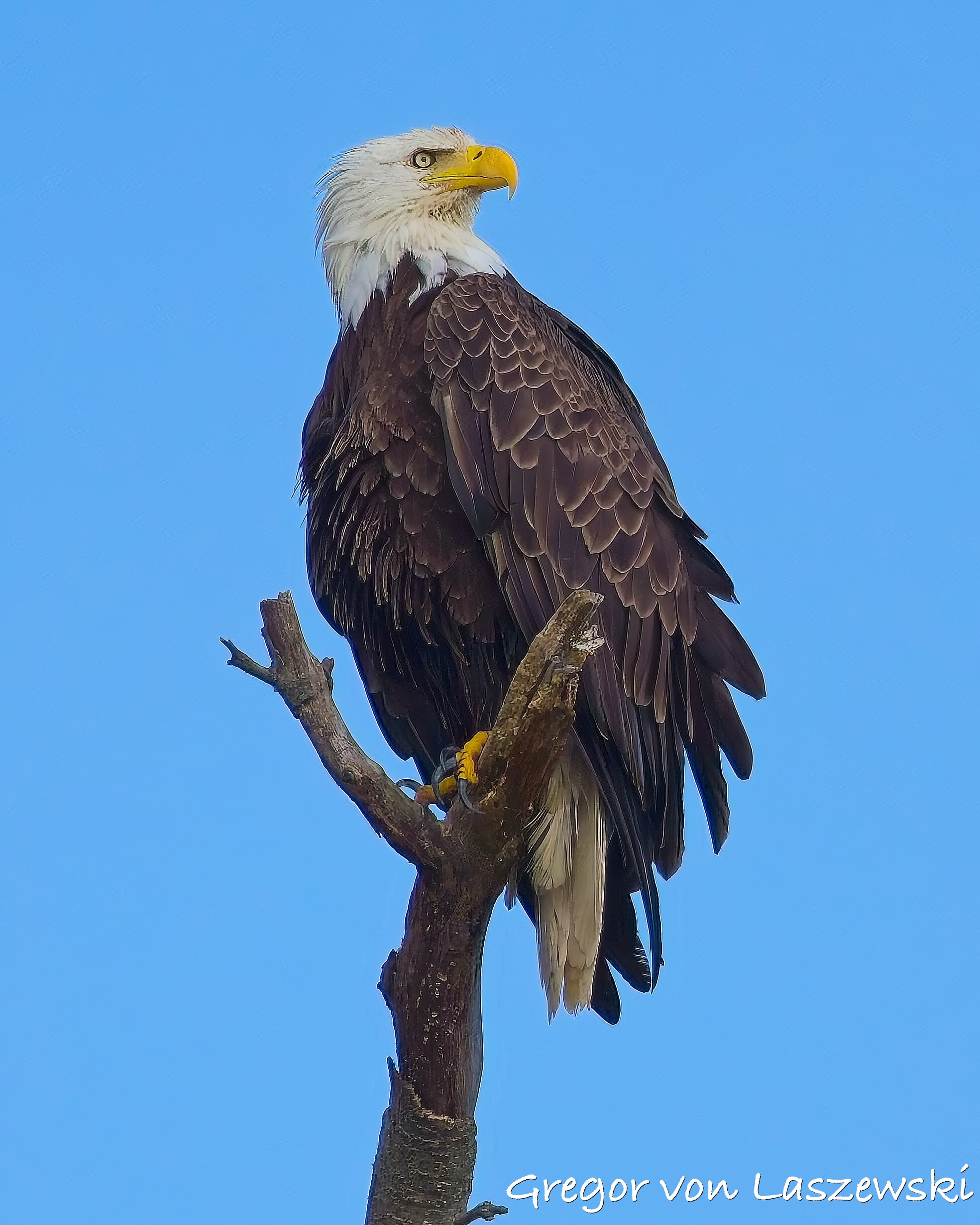 The eagle was calm, grooming and surveying the surroundings. Whenever the wind drifted me too close, I paddled back to a safe distance. A large pontoon boat nearby had to move as it drifted too close to shore. A woman aboard was disappointed and concerned that their engine might disturb the eagle. As the eagle looked toward their boat, I captured some great shots of it gazing straight at us. After that, the eagle relaxed again, and I continued observing for a while longer. Wanting to avoid being out after dark, I eventually headed back.