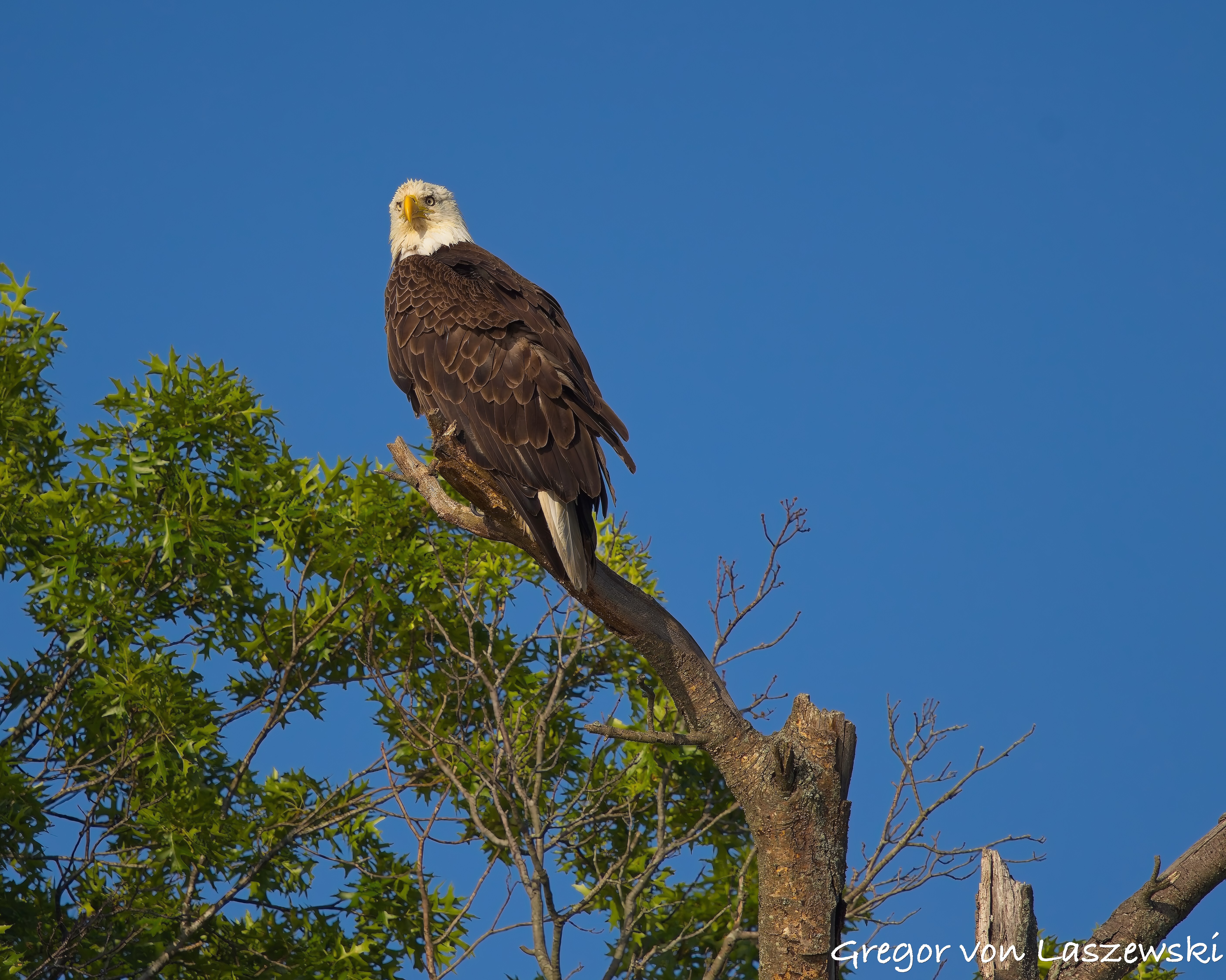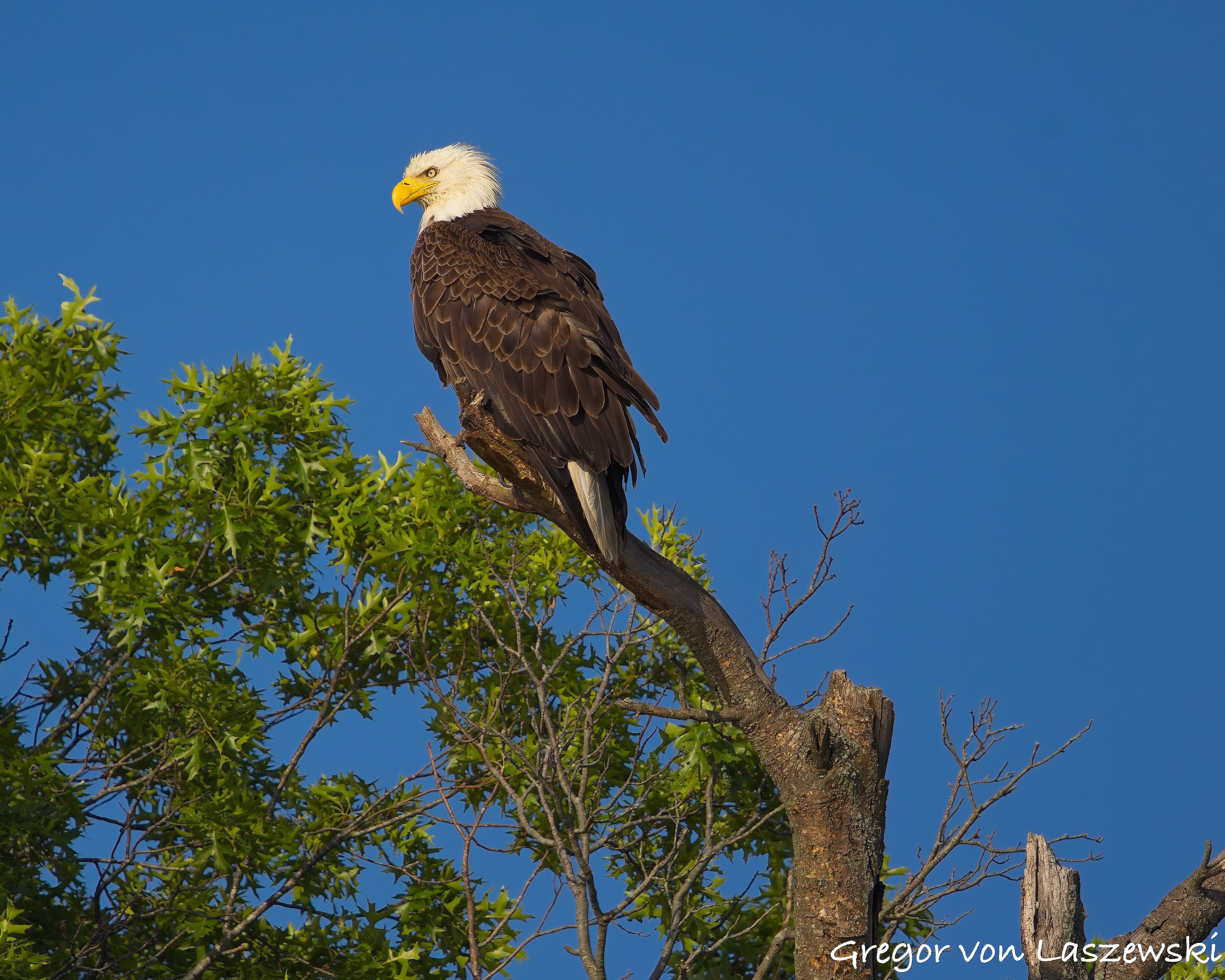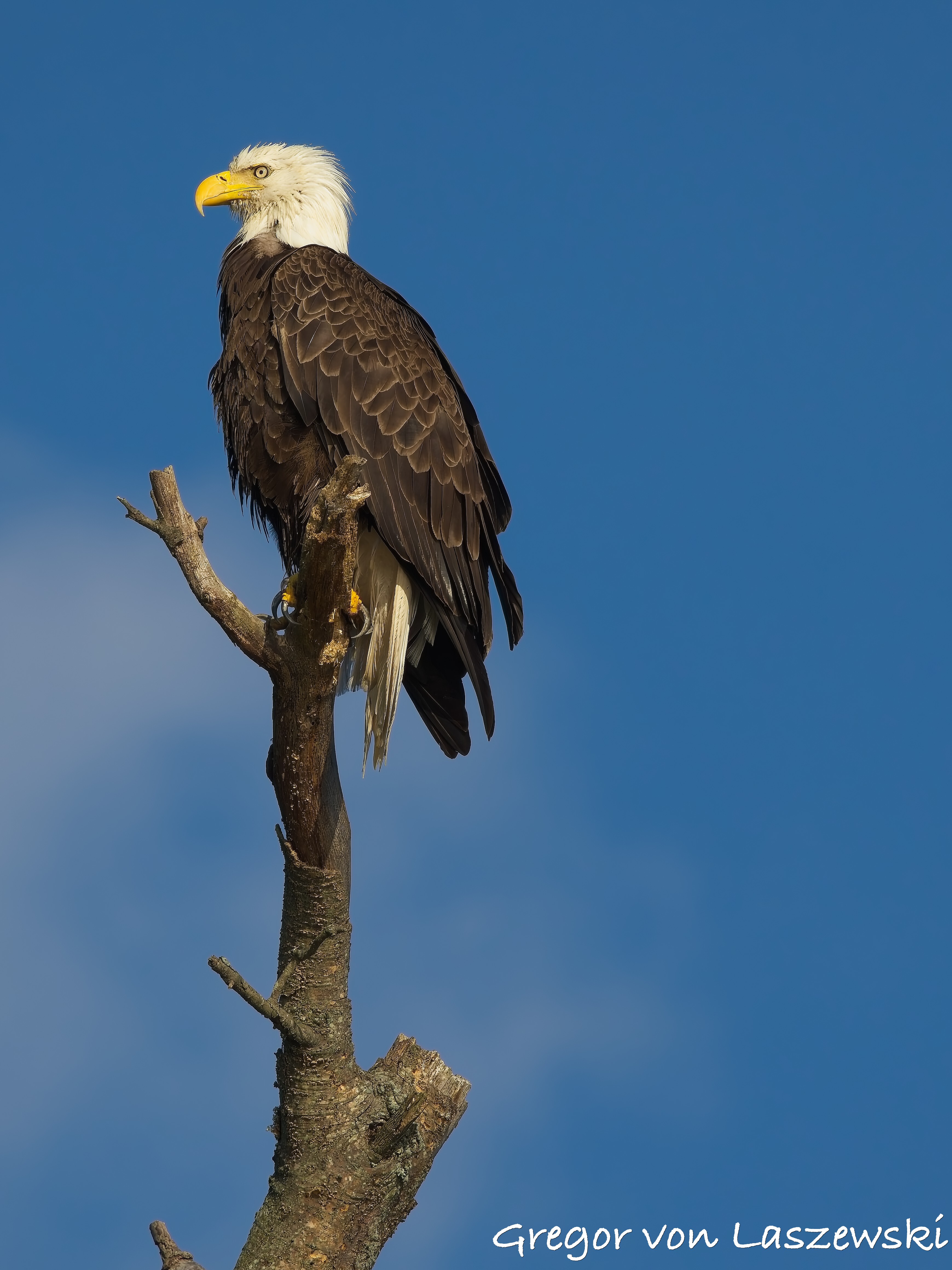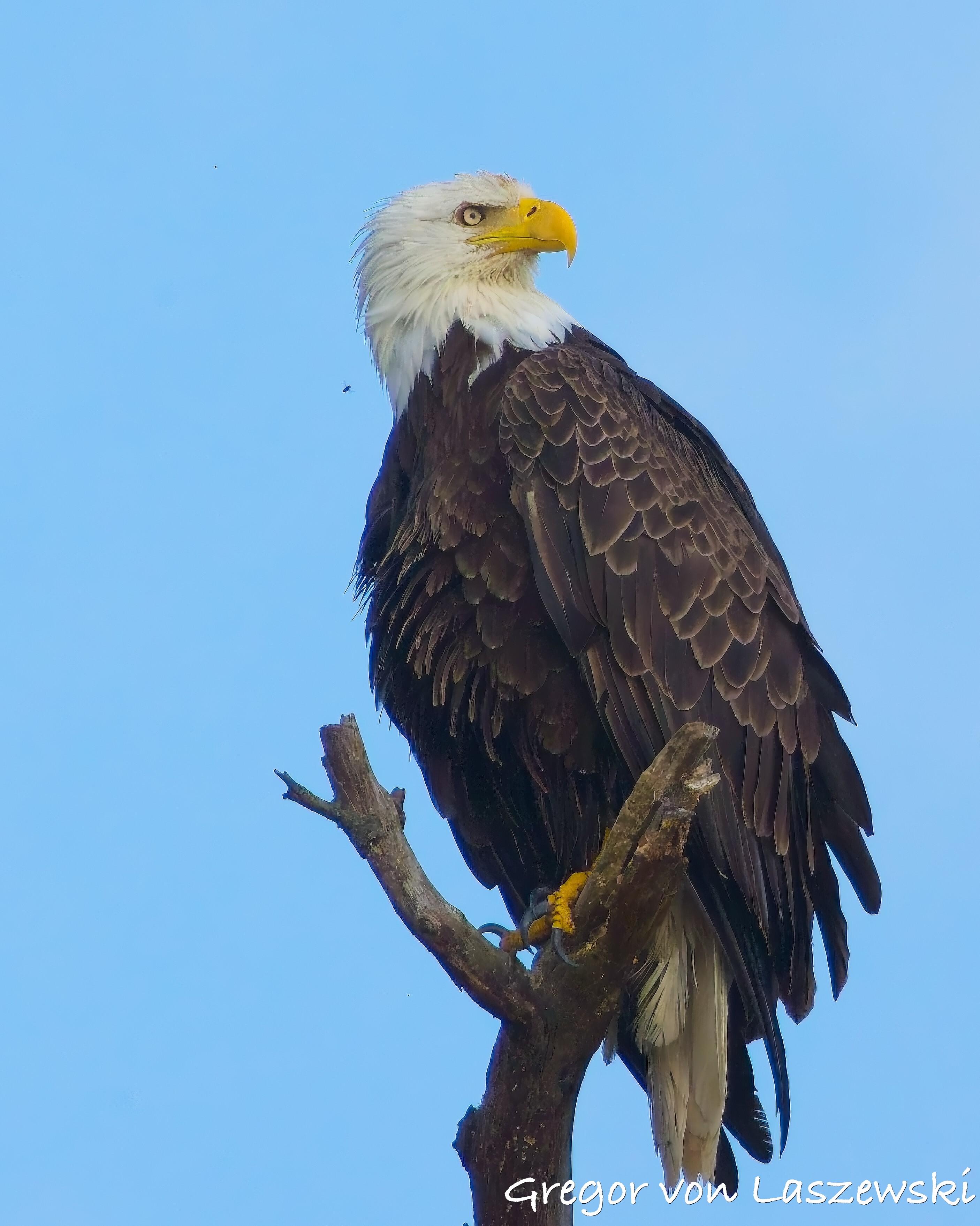 The eagle was calm, grooming and surveying the surroundings. Whenever the wind drifted me too close, I paddled back to a safe distance. A large pontoon boat nearby had to move as it drifted too close to shore. A woman aboard was disappointed and concerned that their engine might disturb the eagle. As the eagle looked toward their boat, I captured some great shots of it gazing straight at us. After that, the eagle relaxed again, and I continued observing for a while longer. Wanting to avoid being out after dark, I eventually headed back.