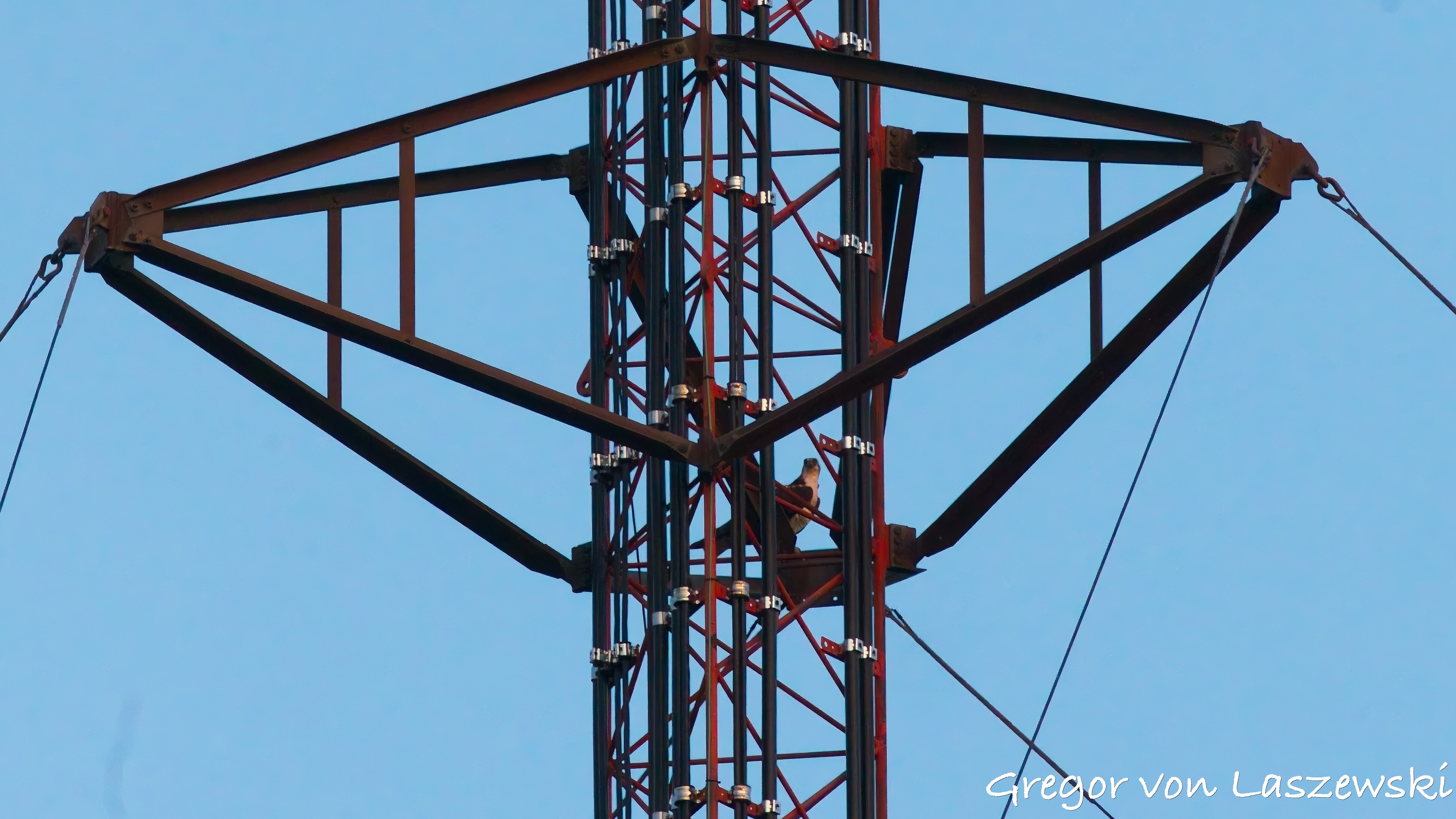 On my way home, I passed by the cell phone tower again around 9:00 p.m. and decided to do a final observation. I found one osprey in the nest. Just three minutes later, the second osprey arrived and landed on the tower. Upon reviewing my images, it didn’t appear to bring nesting material or food. Then I observed something new: after four minutes in the nest, the second osprey flew off to the south but surprisingly circled back and landed halfway down the tower at the platform for the stabilization wires. The osprey in the nest began calling loudly—possibly out of anger or disappointment. The second osprey remained perched halfway up the tower for about five minutes before flying south at 9:12 p.m. The remaining osprey moved higher in the nest as it began to get darker. I ended my observation at 9:30 p.m., with just one osprey remaining in the nest.